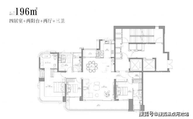 较大的南地块,则排布了3栋A、B座以及4栋。这里边3栋A座43层,3栋B座31层,4栋46层。四栋楼均是一层四户的设计。