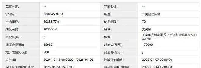龙岗,位于龙岗区龙城街道龙飞大道和青春路交叉口东北侧,土地面积20838.77㎡、建筑面积103508㎡,规定容积率≤4.97,土地用途为“二类居住用地”,以起始价179900万元挂牌出让。