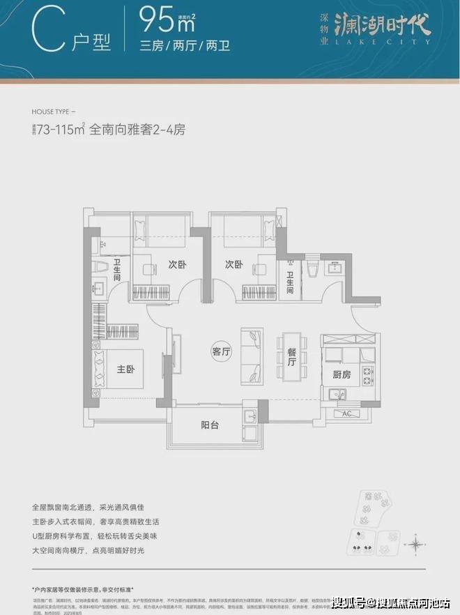 95㎡的3房2厅2卫,设计的是横厅南北通透格局,客餐厅一体化5.8米开间,3个卧室分别做到了3.2米/2.9米/2.9米的宽度,主卧套间设计,U型厨房,卫生间干湿分离,得房率77-78%(不含赠送),阳台主朝西南或东南向。