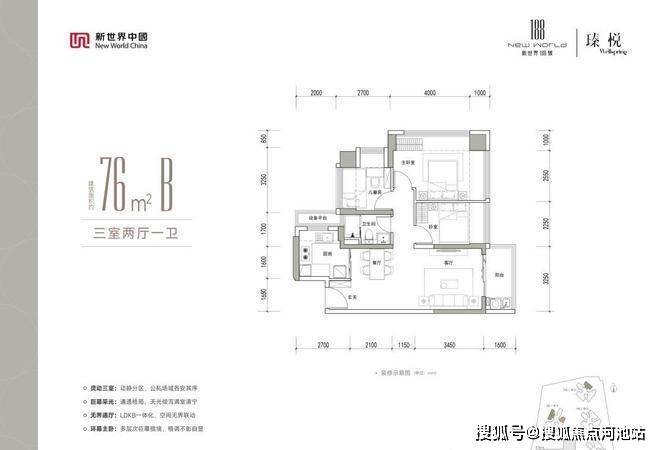 76㎡B户型:3房2厅1卫经典竖厅设计,客厅开间3.25米,LDKB一体化,连接景观阳台,通风采光俱佳,三间卧室布局合理,动静分区,U型厨房设计,操作动线流畅,卫生间干湿分离设计,提升使用效率,主卧270°无柱转角飘窗,拥有更大的景观面,三栋一单元朝东南向。