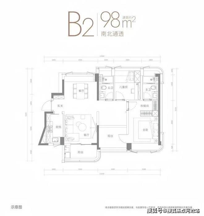 98㎡的3房2厅2卫,南北通透横厅,玄关入户。客厅3.28米宽,四室朝南,动静分区。主卧15.13m²/次卧10.85m²/次室8.25m²(含飘窗)。L型厨房,卫生间干湿分离。得房率75.91%(不含赠送),阳台5.6m²,西南或东南向。