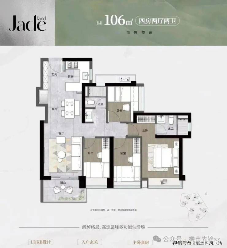 建面106平米:4房2厅2卫,传统的竖厅户型动静分区;同样的有冰箱预留位,U型厨房设计;有东南和西南两种朝向,3个卧室和阳台同样的朝向