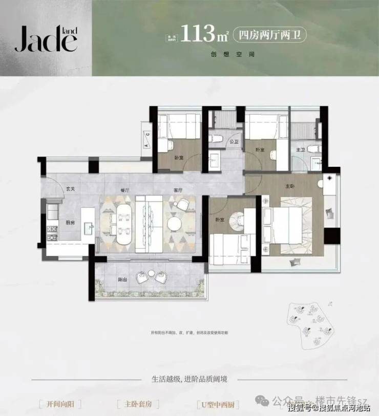 建面113平米:4房2厅2卫,横厅设计南北通透,而且阳台都是东南朝向,深圳夏长冬短,这种通透户型很受欢迎,也符合当下年轻人的选择;开放式厨房配合大阳台,进门第一感觉就是客厅很开敞;主卧是 L 型飘窗,保证了整个房间的采光,中间被承重墙割开,不管是为了空间利用还是美观,最好利用部分做衣柜。
