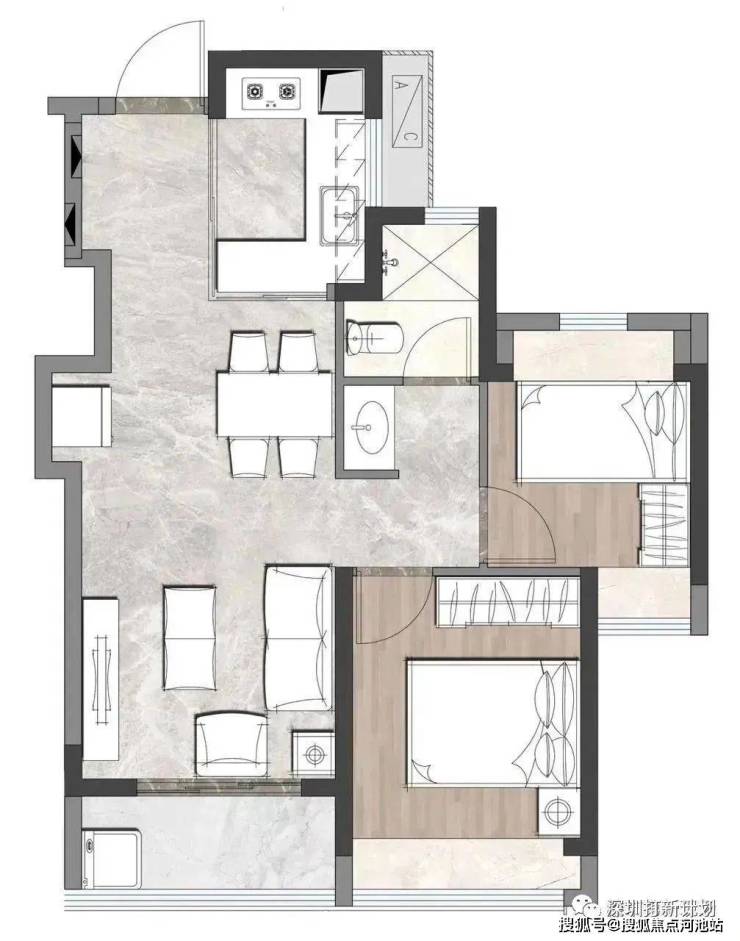 约79㎡三房一卫是是传统竖厅三房结构,同样具有低总价优势,除厨房和小卧室外,其它功能间都是优势朝向。需要注意的是小卧室虽然不是优势朝向但是双面采光双飘窗的。