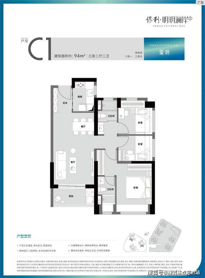 竖厅格局,客厅3.5米开间,进门独户玄关,主卧大套间,公卫三段式分离设计,得房率:75.6%(不含赠送),阳台有西南向、东南朝向或朝正南向。