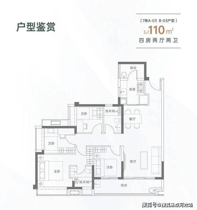 110㎡的4房2厅2卫,设计的是经典竖厅格局,进门入户玄关,LDKB一体化设计,四开间朝南,动静分区,客厅连接次卧出大阳台,L型厨房还带1个生活阳台,卫生间干湿分离,得房率约82%(不含赠送),东南朝向。