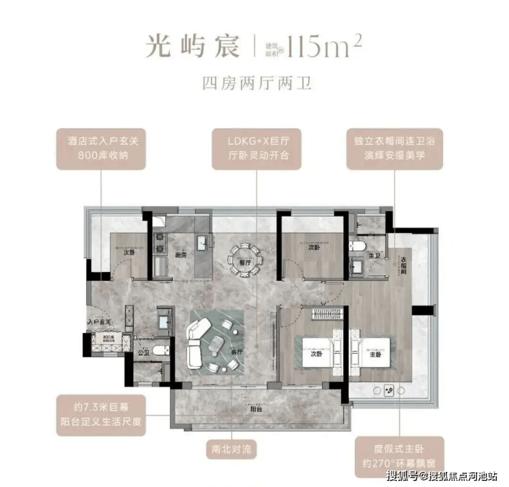 115㎡的4房2厅2卫,设计的是竖厅南北通透格局,进门入户玄关,客厅4.45米开间,餐客厅分离设计,客厅连接次卧出10.87m²的观景大阳台,L型中式+岛台灵动式厨房,公卫三段式干湿分离,得房率约78.27%(不含赠送),阳台主朝东南或西南向。靓点:南北对流+7.25米长超大观景南向阳台,超大主卧+270°无柱转角飘窗