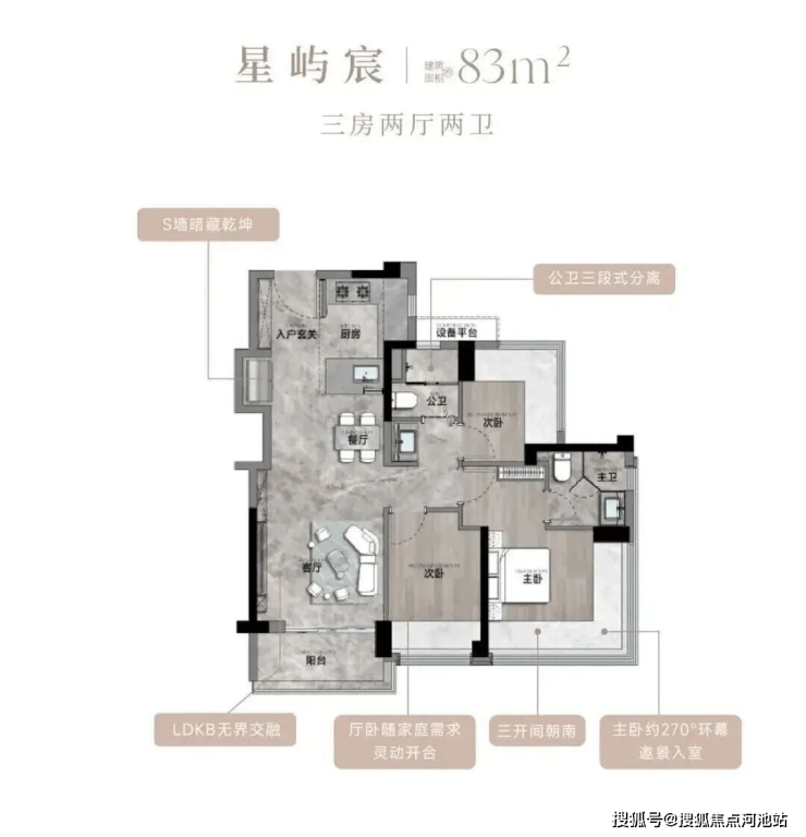 83㎡的3房2厅2卫,设计的是经典竖厅格局,客厅3.35米开间,LDKB一体化,S墙设计预留双开门冰箱卡槽位,三开间朝南,动静分区,U型厨房,公卫三段式干湿分离,赠送1.98平设备平台,得房率约77.15%(不含赠送),阳台5.02m²西南或东南朝向。靓点:83平做到了3房2卫,主卧270°无柱转角飘窗,厨房烟道外置+额外赠送设备平台,并且是纯南向格局。