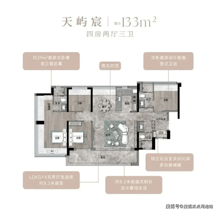 133㎡的4房2厅2卫,设计的是竖厅南北通透格局,进门入户玄关,客厅5.4米开间,餐客厅分离设计,客厅连接次卧出12.3m²的观景大阳台,L型中式+岛台灵动式厨房,公卫三段式干湿分离,得房率约78.27%(不含赠送),阳台主朝东南或西南向。靓点:超大客餐厅南北对流+8.2米长超大观景南向阳台,超大主卧+270°无柱转角飘窗
