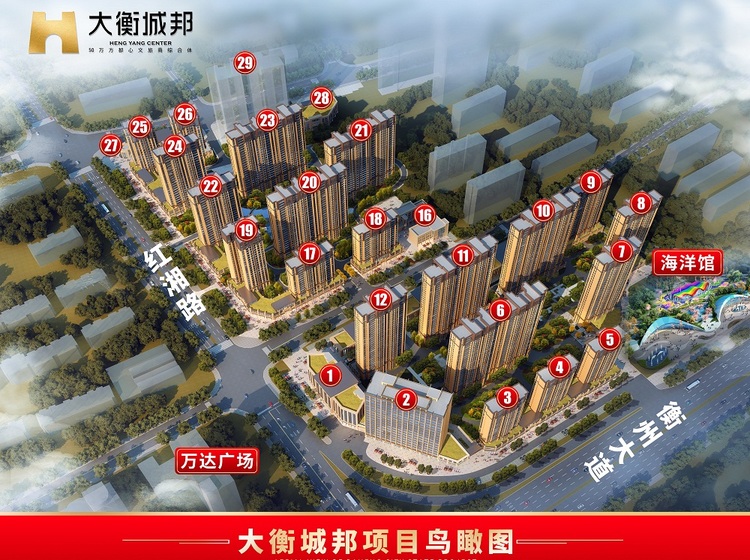 项目位于衡州大道与红湘路两条主干道的交汇处,衡阳主城区核心地段,交通十分便捷,教育、医疗、商业等配套完善,是衡阳市区高端居住人口密度较高的核心区域,整个项目与万达广场一路之隔,周边围绕众多新建住宅小区,项目分为南区和北区,由胡角路分隔。