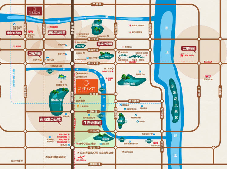 华远万江时代之光三横三纵多维交通畅达全城,距火车站仅约5.4公里,距衡阳东高铁站仅约13公里,沿蒸湘南路直通南岳机场仅约16公里。距南二环约1.9公里,二环线拉通与石鼓、蒸湘及珠晖区的快速连接,直通衡阳高铁站、衡阳火车站、华新开发区、衡阳各高速公路出口,形成全城畅达交通脉络。
