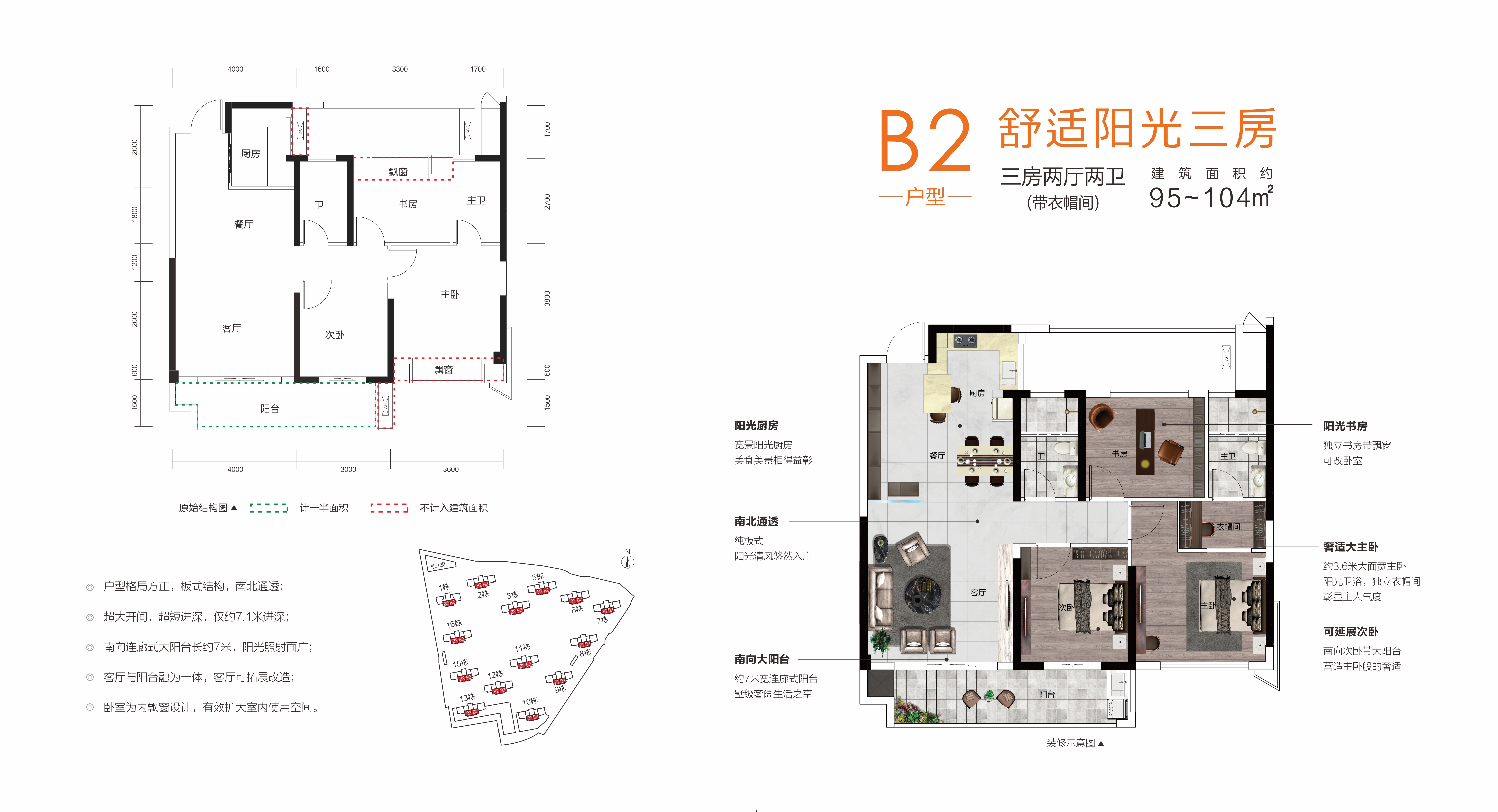 社区以一栋一单元,两梯四户纯板式创新户型,95-125㎡三房四房,南北双阳台,方正通透,采光通风俱佳,格局方正,南北通透,超短进深,动静分区明显,无死角、无暗房、高使用率,室内可拓展使用的空间大,高得房率。