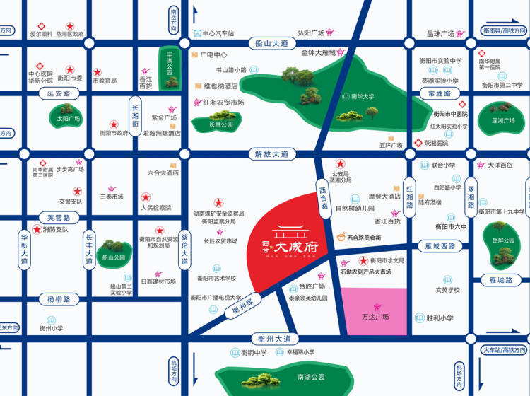 驾车:沿西合路到解放大道、衡州大道、蔡伦大道等主要交通干线;5分钟沿解放大道可以到市区最繁华的解放路,10分钟沿衡州大道可以到许广高速、泉南高速;15分钟可以到火车站;20分钟沿衡州大道可以到高铁站、25分钟到南岳机场