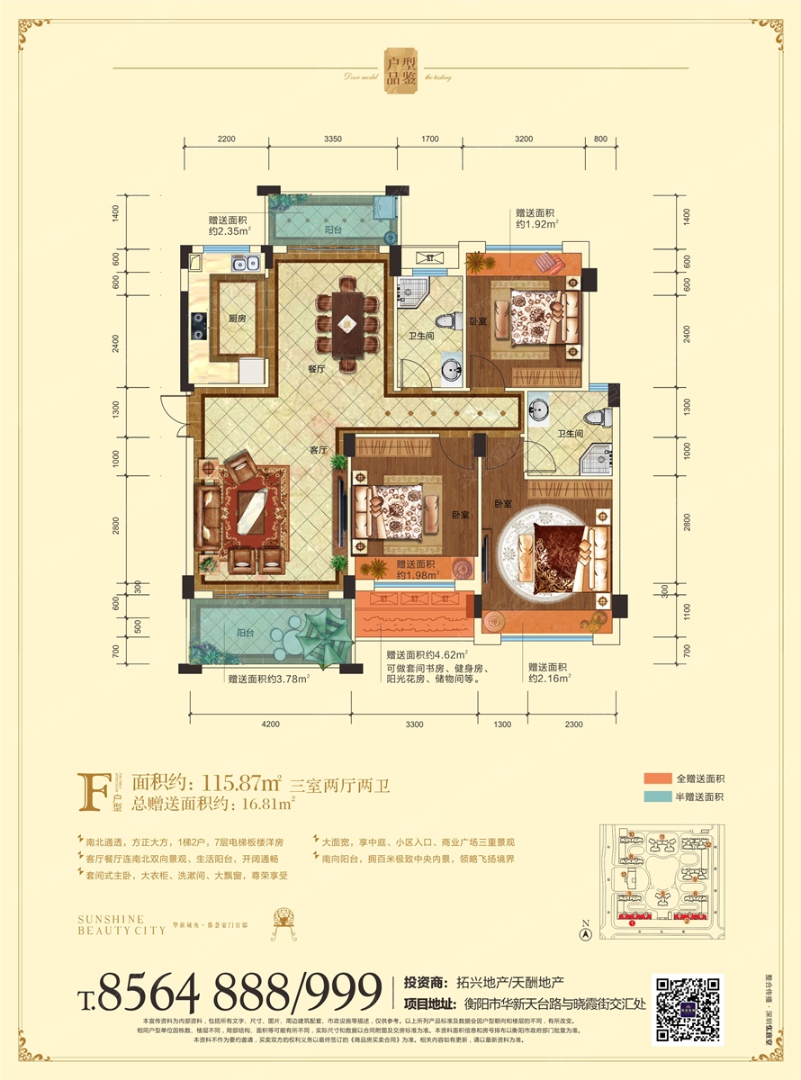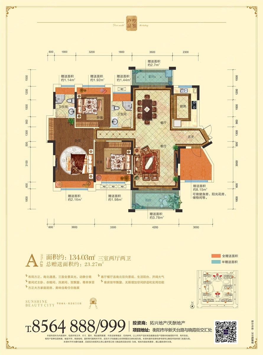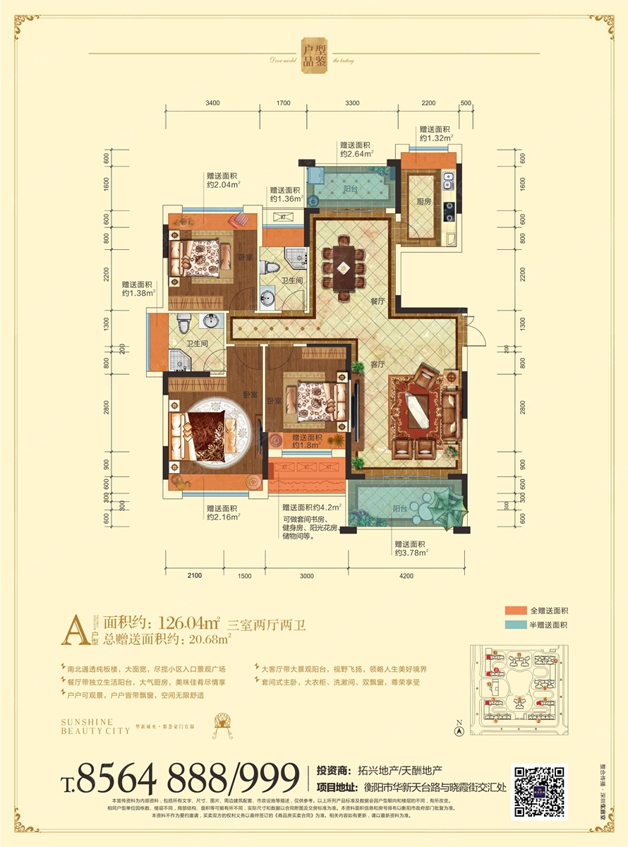 阳光美城位于华新区生态公园南(恒大绿洲正北面)。南北向的华新大道与东西向的衡州大道形成畅达通路。项目是由衡阳市百年房地产开发有限公司开发,项目总占地面积约90亩,总建筑面积约18万㎡(其中住宅15万㎡),共1184户,容积率2.6,绿化率40%。共11栋。其中首一期总建筑面积约10万㎡,共6栋700套住宅左右,主要产品户型为97-151㎡的全飘窗、大阳台、高赠送的三房及四房。