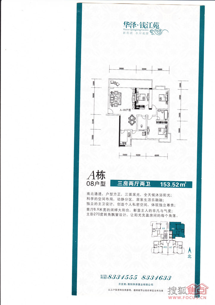 华泽钱江苑由实力雄厚的浙江开发企业华泽置业倾力打造,项目地处湘江两座大桥中段,直对解放路繁华商业街,周边人文气息浓厚,紧临欧阳故居,“彭玉麟”大帅故居,“湘南学联”、“东岳观”等名胜建筑遍布四周,市七中学校、东方女子医院、银行、购物中心、市场等配套设施齐全,居繁华处幽静,是成熟居家优选区段。项目占地面积7494.6平方米,建筑面积约50000平方米,由两栋29层双子楼组成,共260户住宅,户型以134―162m2宜居三房四房为主。地上二层商业配套,面积6600m2,地下车库拥有一百余车位,2009年中下旬可全面竣工交付使用。
