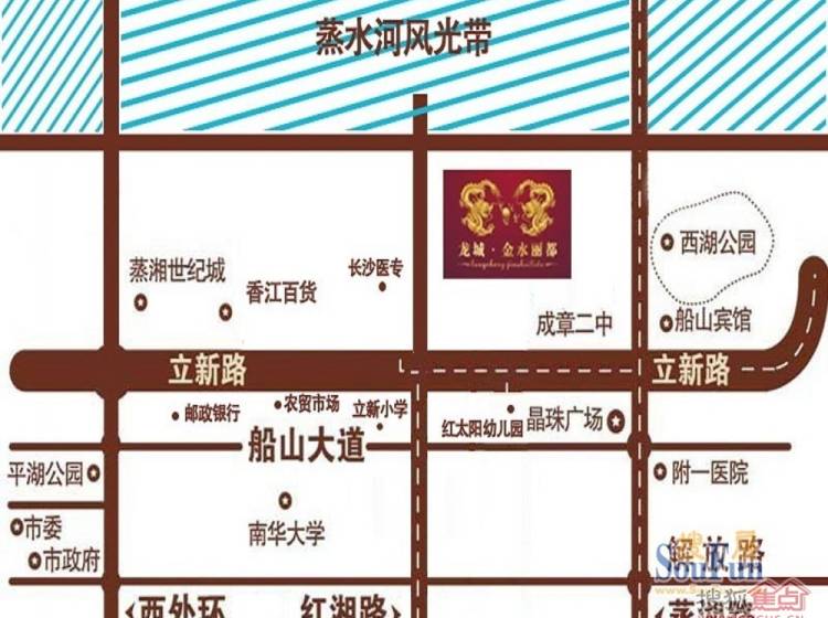 项目是由衡阳市富春房地产公司开发的,位于红湘北路与立新大道交汇处往北蒸水河方向前行200米,再右转前进50米即可到达。项目北面紧临蒸水风光带,南面是农业局,周边有学校及单位的家属楼,该地段是蒸湘区商圈的一级辐射地带,目前有9路、303路、30路、32路等多路公交车经过此地段可到小区,交通便利。附近有中国银行、农业银行、农村信用社等多家金融银行,有红太阳幼儿园、英豪幼儿园、成章实验中小学、长沙医专等教育机构,好的学习氛围让你的子女成功成才。附近商场有香江百货、晶珠广场、步步高、家润多超市让您购物非常方便。医院有附一医院、妇幼保健院为您的健康保驾护航。随着红湘北路大桥的拉通及3公里长的蒸水风光带、面积145亩的亲水公园的修建,使我小区升值潜力无可估量,因此,无论您是投资还是置业龙城•金水丽都都将会是物超所值的。