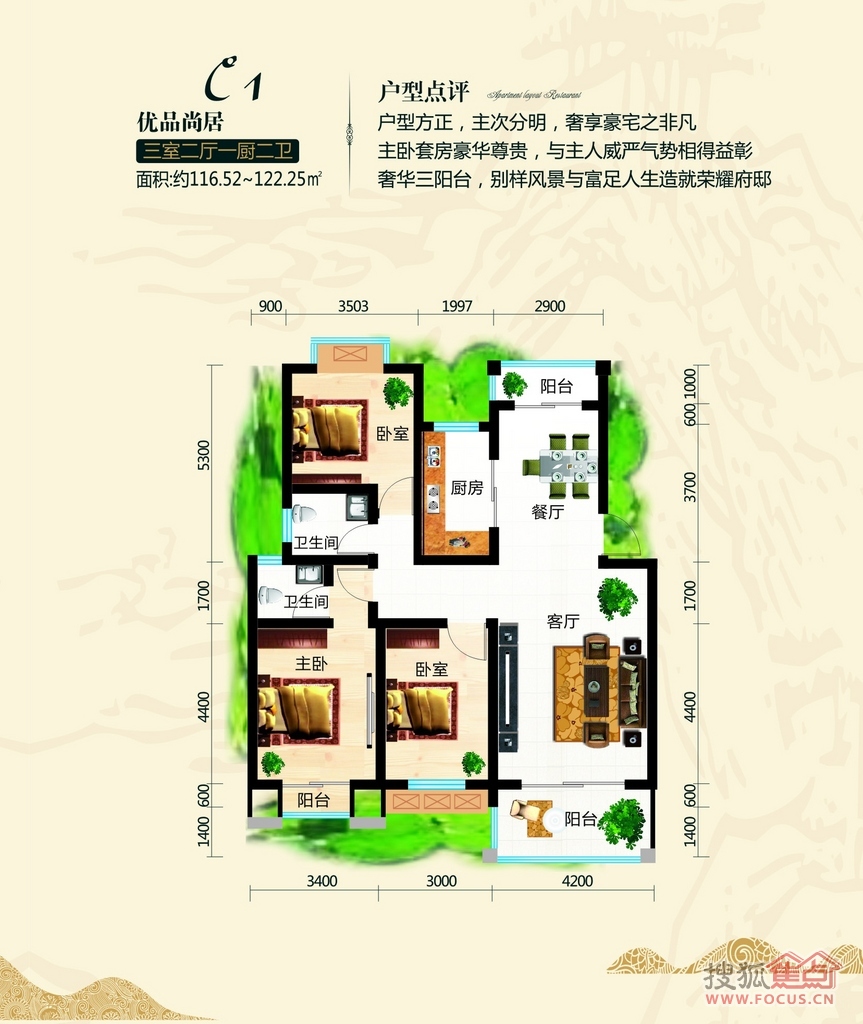 3室2厅2卫-C1户型建筑面积约116.52-122.25㎡