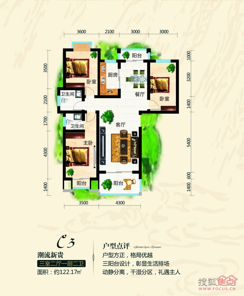 3室2厅2卫-C3户型建筑面积约122.17㎡