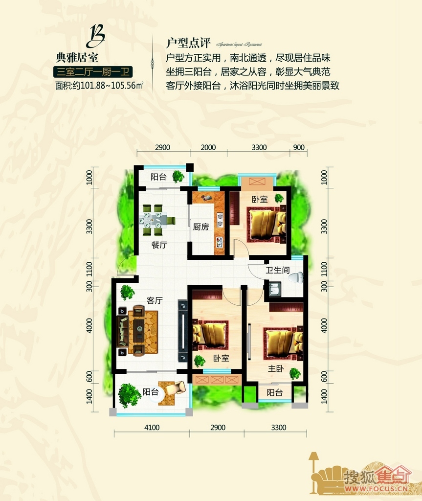 3室2厅1卫-B户型建筑面积约101.88-105.56㎡