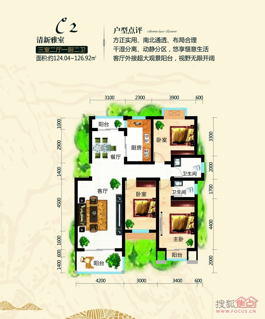 3室2厅2卫-C2户型建筑面积约124.04-126.92㎡