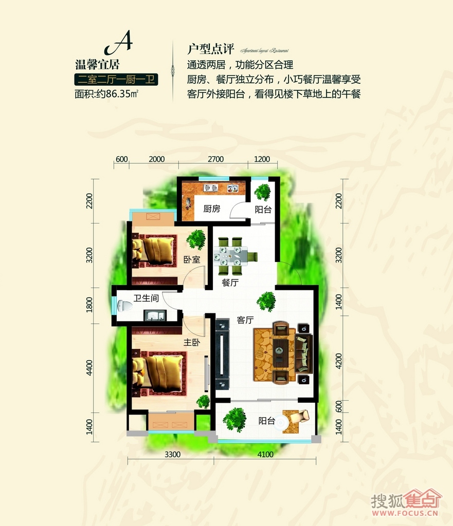 2室2厅1卫-A户型建筑面积约86.35㎡