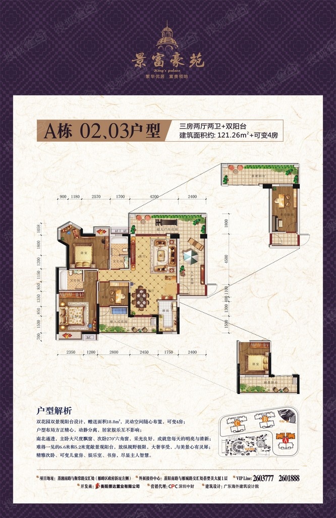 景富豪苑占地面积23亩,近7万平米,分A、B、C三栋开发、面积118-135平米,三室二厅二卫一厨双阳台,赠送近20平米,先推出A栋,楼栋之间的距离都是非常宽的,项目与项目之间距离高达100米,栋与栋空间有15米,户与户空间有8米,可以充分保证您在家全天候的日照及良好的视觉效果,近万平方商业体,设有银行、美容院、咖啡厅、及高档会所、超市、下沉式商业体、等等入住,让您的生活极为便利。 观光电梯一览所有美景,特邀请广东著名的大师,来设计18.8米高及超大电子屏仿秦代古钱的风车,寓意着住在这里的人会风生水起兴旺发达,也是衡阳标志性建筑物,小区内有近万平方的私属中心花园,设有休闲长廊及凉亭,配有健身器材、亲子嘻哈乐园、篮球场、羽毛球场、艺术景点风车。再加上各种珍贵稀有的树木,以及四季花卉的搭配,给整个社区营造出四季如春的画面!小区内智能化门禁和人车分流,全封闭式管理,物业24为您提供贴心服务,让您高枕无忧!
