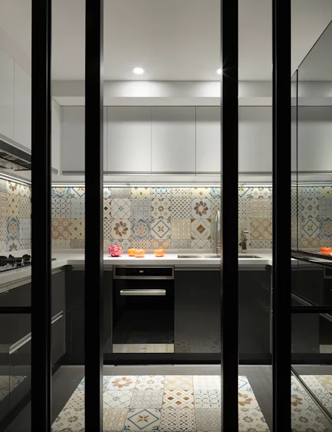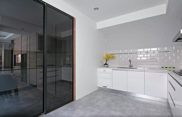 黑色铁件的拉门也选用不穿透的玻璃材质,与白色的厨房呈现强烈对比。