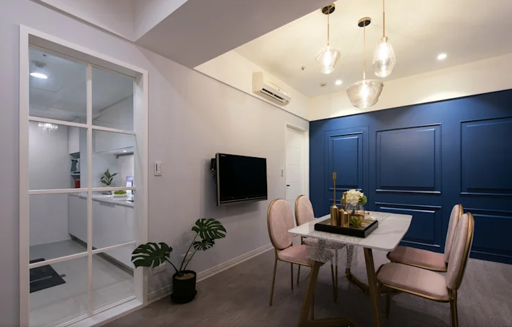 白色格状的拉门配上湖水色,室内空间清新轻盈,给人舒适自在的感受。