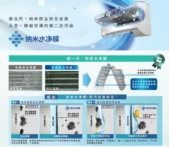 大多数人认为清洁空调只是把过滤网清洁即可,其实不然,空调热交换器才是潜藏在空调中的“细菌集中营”。为解决热交换器的清洁难题,松下YE新品搭载松下新一代纳米水净膜技术。纳米水净膜采用纳米二氧化矽材质的凹凸特性,对热交换器粗糙表面进行光滑处理,翘片表面光滑后灰尘容易滑动;并实现热交换器表面喷涂,起到抑制尘埃和油分的作用。使机器持久清洁,为家人的清新空气续航。
