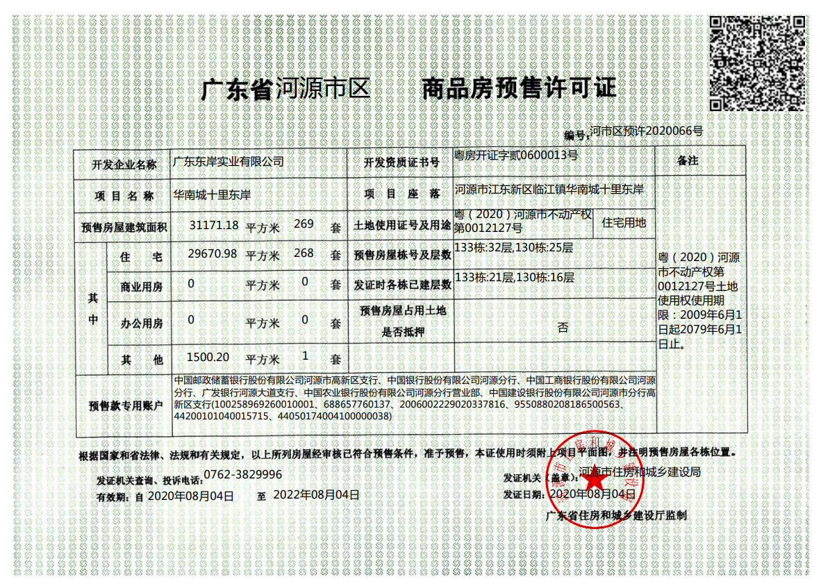 - 河市区预许2020066号 详情发证时间 2020-08-04绑定楼栋133栋:32层,130栋:25层证件照片
