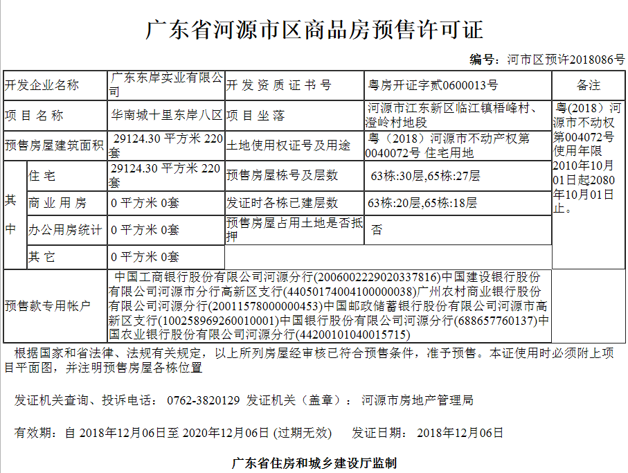 - 河市区预许2018086号 详情发证时间 2018-12-06绑定楼栋63栋:30层,65栋27层 220套证件照片