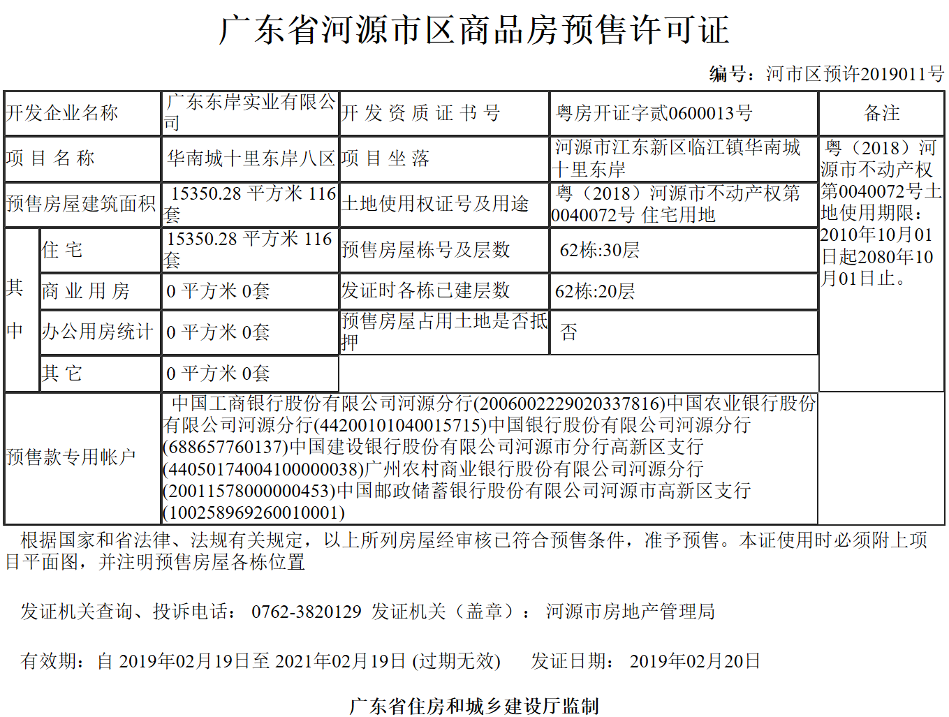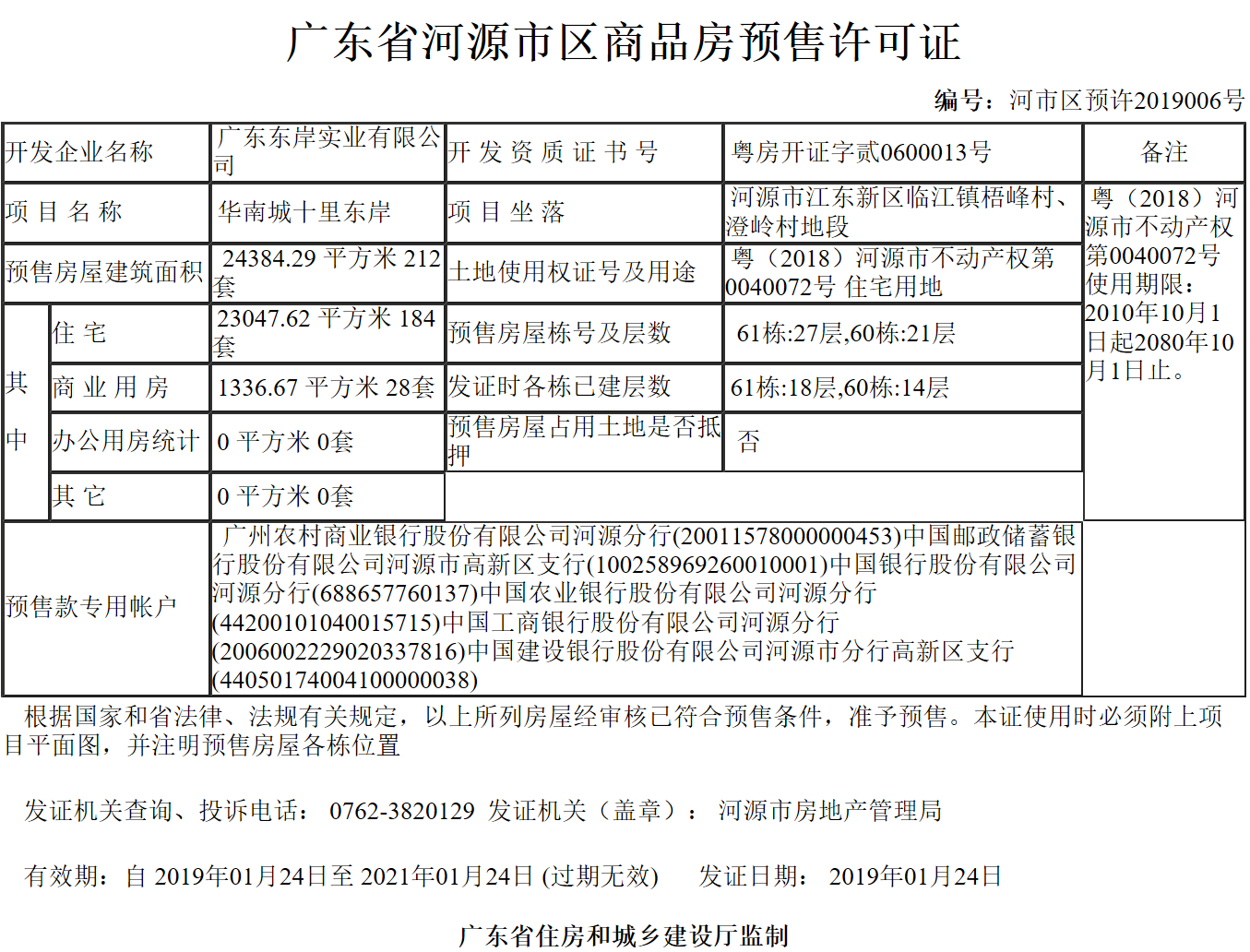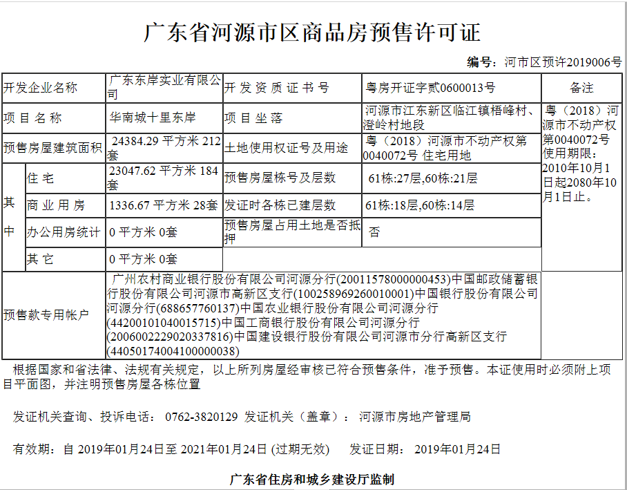 - 河市区预许2019006号 详情发证时间 2019-01-24绑定楼栋61栋:21层,60栋:14层证件照片
