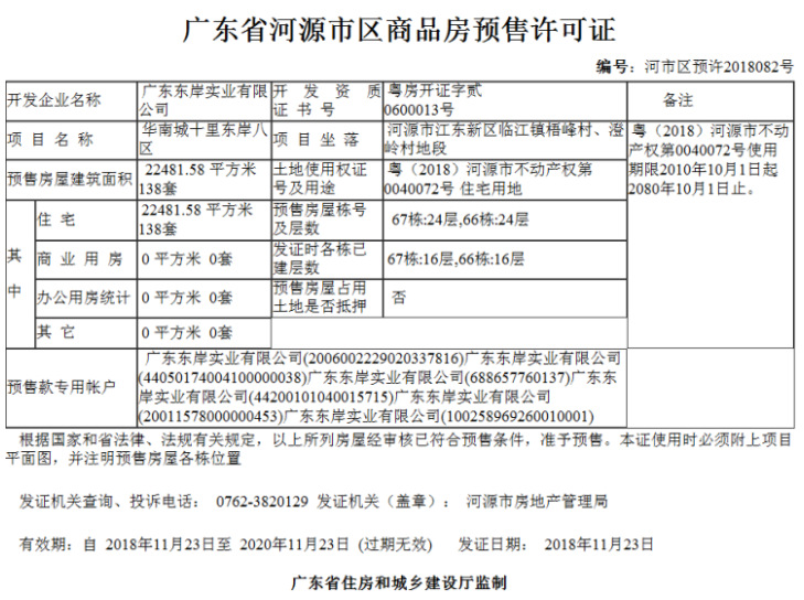 - 河市区预许2018082号 详情发证时间 2018-11-23绑定楼栋67栋:24层,66栋:24层 138套证件照片