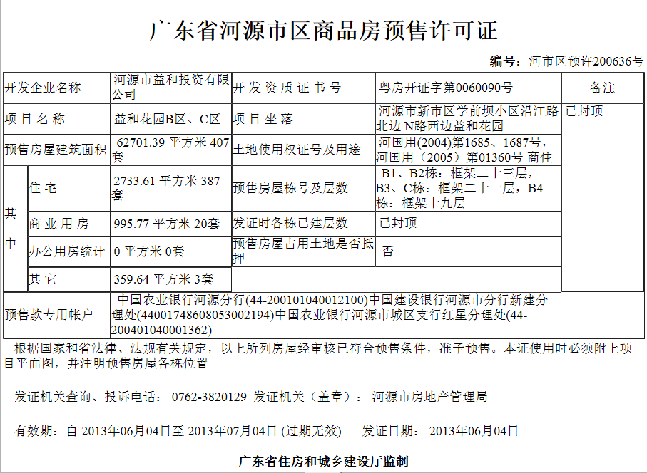 益和花园是由河源市益和投资有限公司投资开发,雄踞河源市黄金宝地沿江东路(市体育馆对面),总用地面积2万多平方米,由二栋23层主楼,三栋21层,五栋19层欧陆风情的高尚住宅组成。内设大型地下室停车库,1-2层为商铺。豪华配置户型有:三房二厅、四房二厅、五房二厅、单身公寓及豪华复式近800套!