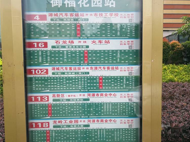 御福花园站(公交站):102路(东源行政服务中心);万隆城(公交站):102路;113路;118路;16路;29路;4路;骏景花园站(公交站):102路;102路(东源行政服务中心);113路;16路;4路;市消防局(公交站):9路;老干中心(公交站):118路;9路;凯旋城北门(公交站):9路;碧洋家园站(公交站):103路;东埔街道办事处(公交站):29路;雅居悦花园(公交站):9路;源城国税(公交站):102路;4路;