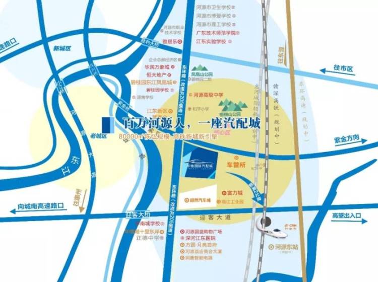 “五纵四横”交通路网,东环高速公路、粤赣高速、河紫高速公路、河梅高速公路等贯穿全城。交通配套涵盖赣深、杭广高铁河源站、惠河城际轻轨,届时将与珠三角实现1小时生活圈。