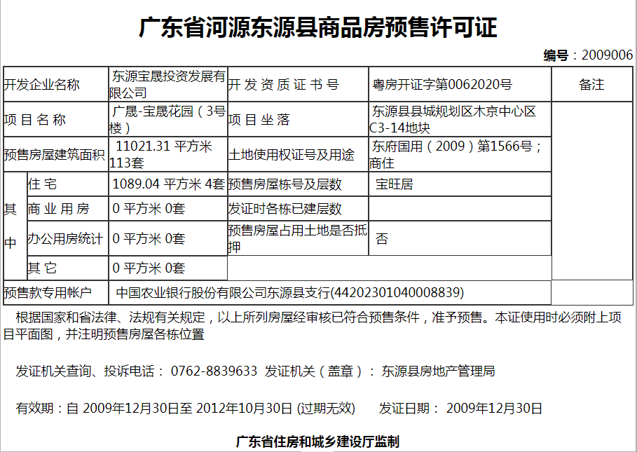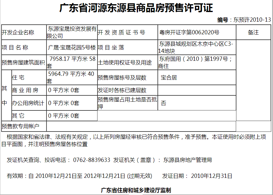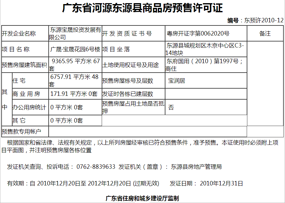 - 东预许2010-12 详情发证时间 2010-12-31绑定楼栋宝润居证件照片