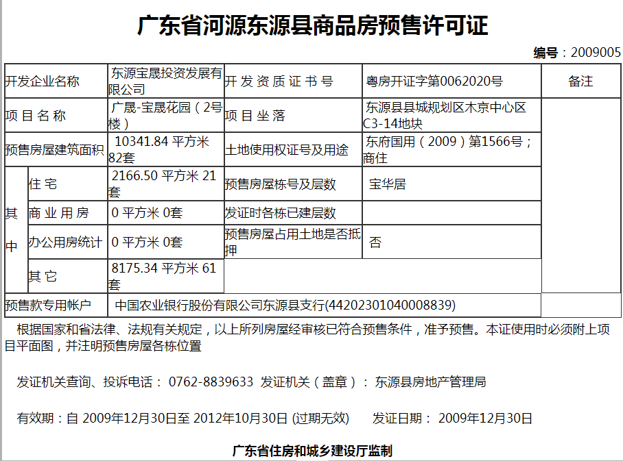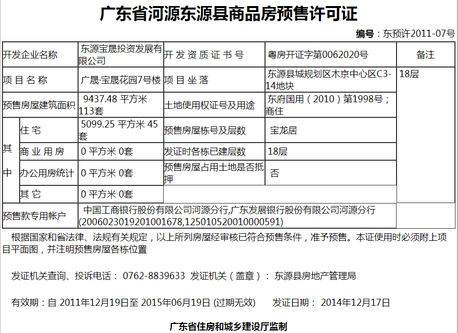 - 东预许2011-07号 详情发证时间 2014-12-17绑定楼栋宝龙居证件照片