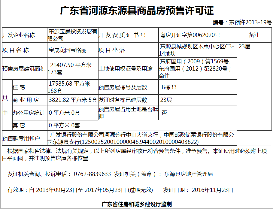 - 东预许2013-19号 详情发证时间 2016-11-23绑定楼栋B栋33证件照片