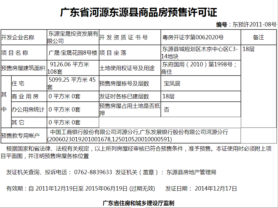 - 东预许2011-08号 详情发证时间 2014-12-17绑定楼栋宝凤居证件照片