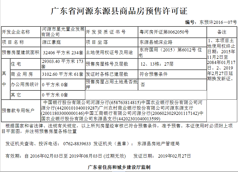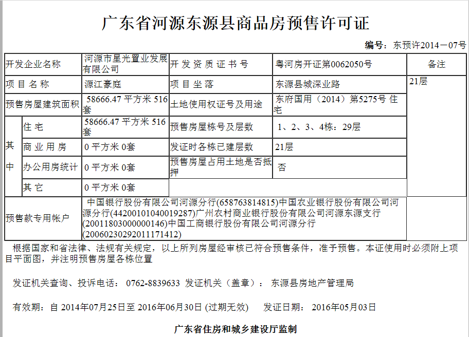 - 东预许2014-07号 详情发证时间 2016-05-03绑定楼栋证件照片