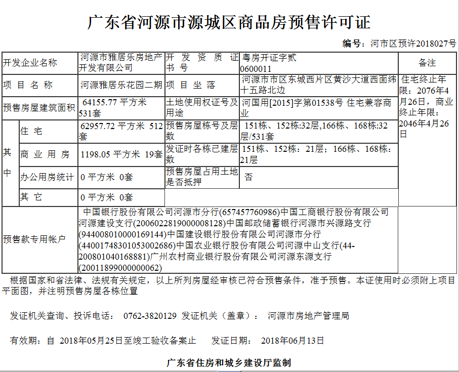 - 河市区预许2018027 详情发证时间 2018-06-13绑定楼栋151/152/166/168栋531套房源证件照片