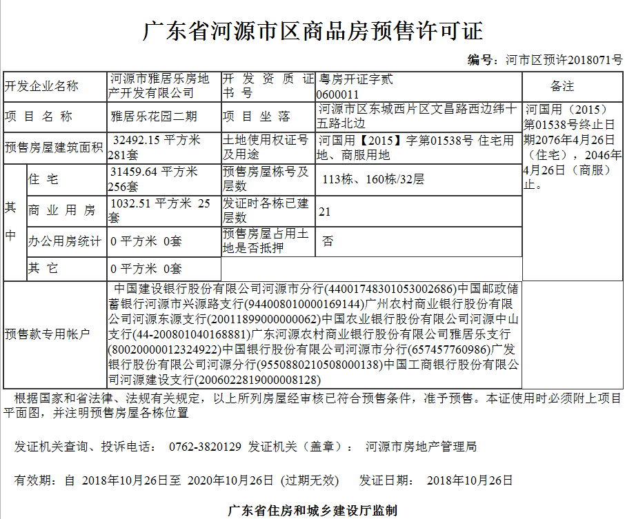 - 河市区预许2018071号 详情发证时间 2018-10-26绑定楼栋113/160栋256套房源证件照片