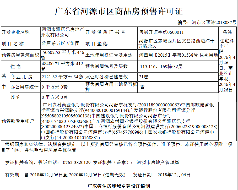 - 河市区预许2018087号 详情发证时间 2018-12-06绑定楼栋115,116、169栋:32层 446套证件照片