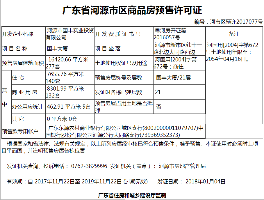 项目是由河源市国丰投资有限公司诚意开发及实力雄厚的深圳市设计院鼎力设计,共二十二层(含负一层地下停车场),集商业、酒店及公寓为一体,配套地面园林式专用停车场。是商务会客、居家生活、休闲娱乐、保健养生的好地方!