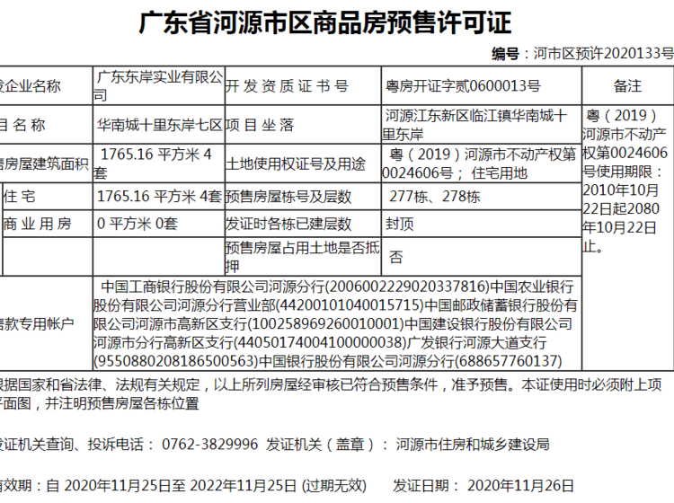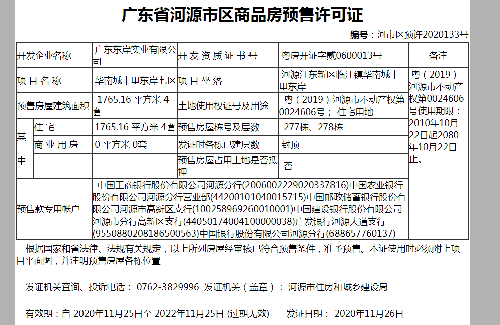 - 河市区预许2020133号 详情发证时间 2020-11-26绑定楼栋277栋、278栋证件照片