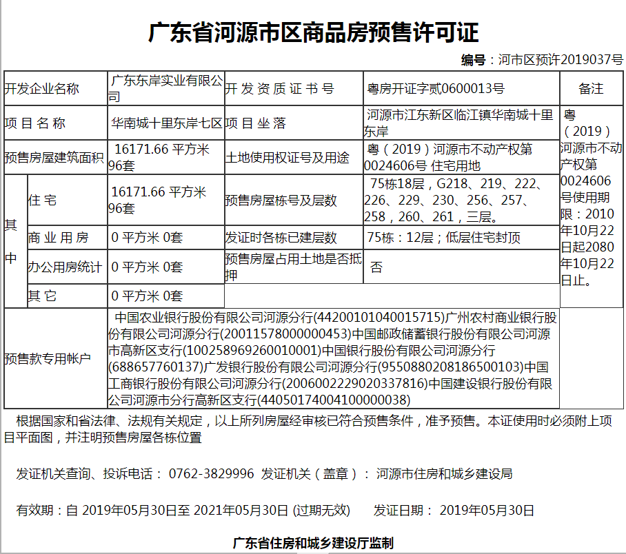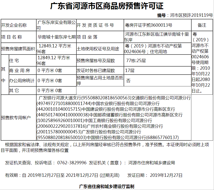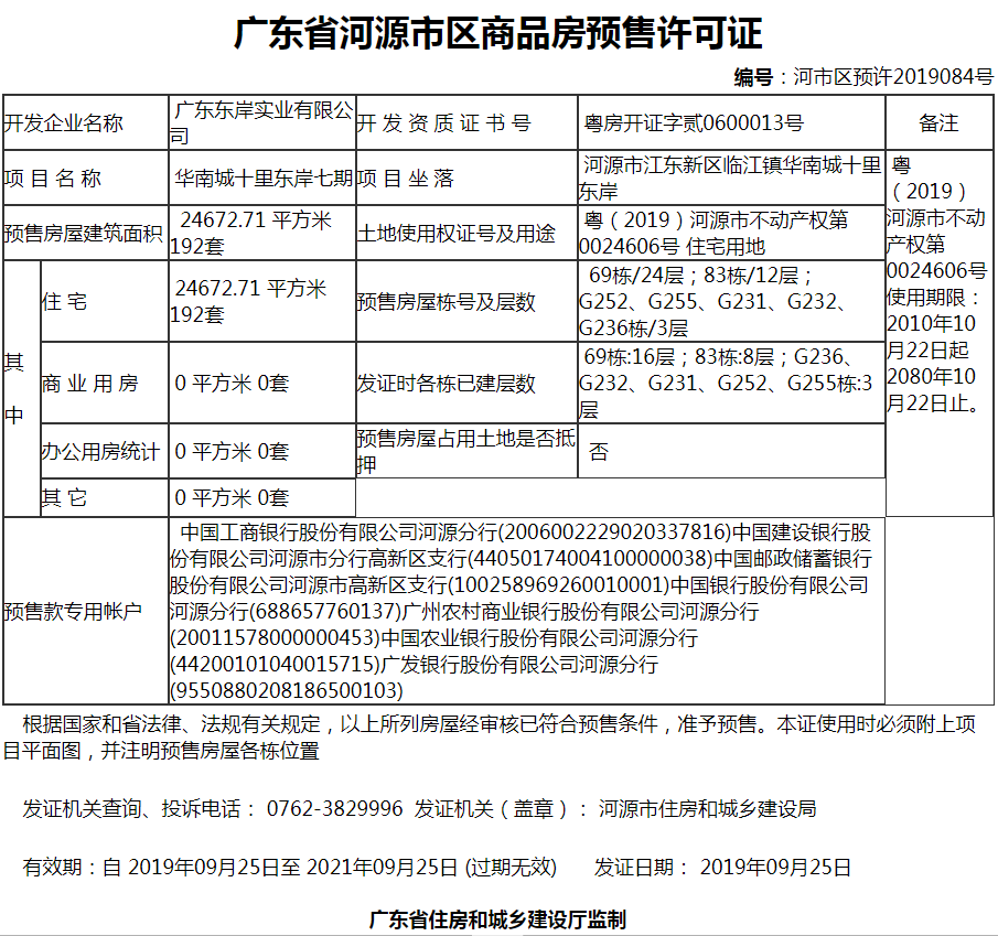 - 河市区预许2019084号 详情发证时间 2019-09-25绑定楼栋69栋/24层;83栋/12层; G252,G255,G231,G232,G236栋/3层证件照片