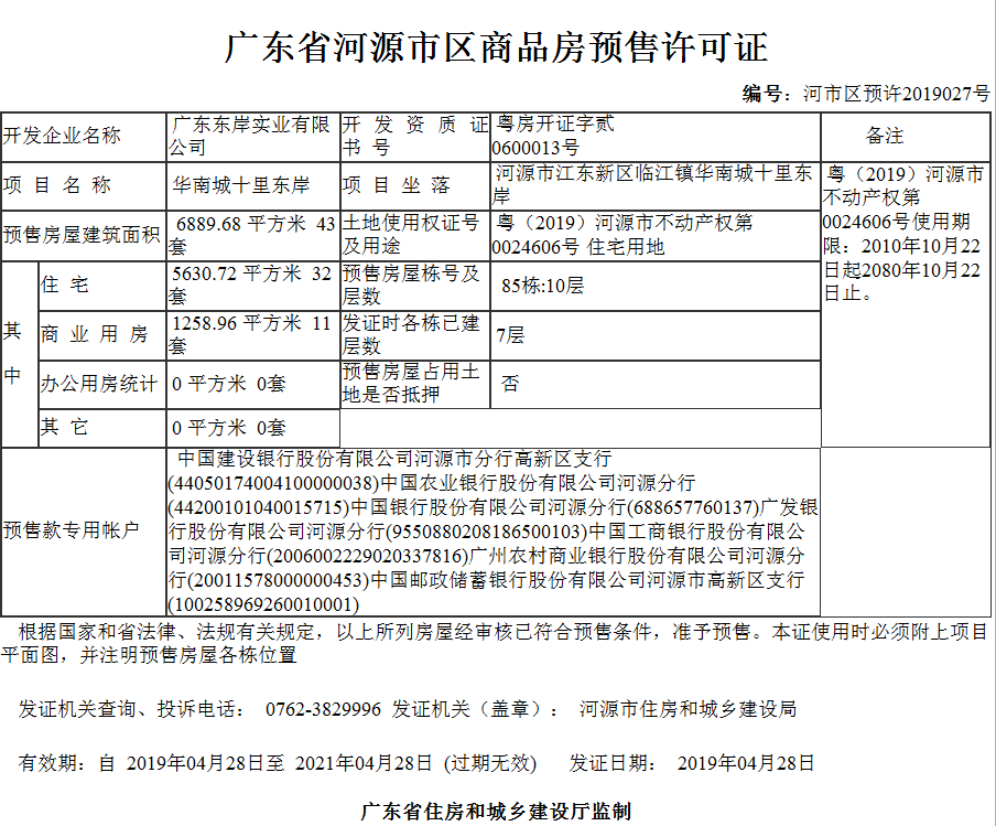 - 河市区预许2019027号 详情发证时间 2019-04-28绑定楼栋85栋10层证件照片