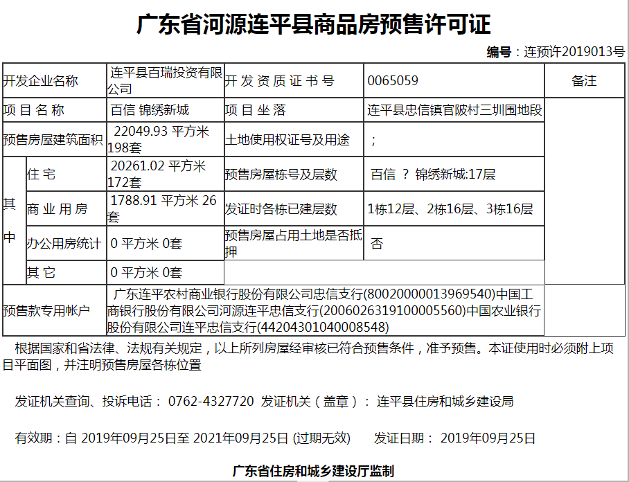 百信锦绣新城项目位于连平县忠信镇忠河路(原三厂位置),占地面积10846.80平方米,总建筑面积50543.28平方米,为忠信人民精心筑建313户高品质住宅。产品主要包括107—137平方米舒适三房、四房,3+1、4+1等户型。户型实用率高、增送面积多。社区内配套有国际园林、休闲广场等,运动休闲从此足不出户。楼下的林萌小道、广阔的绿色植被,以及错落有致的园林空地,是您回家后小憩的较佳场所,陪着老人看孩子尽情嬉戏,在家门口享尽天伦之乐。