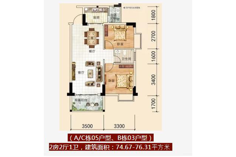 (A/C栋05户型、B栋03户型)2房2厅1卫,建筑面积:74.67-76.31平方米